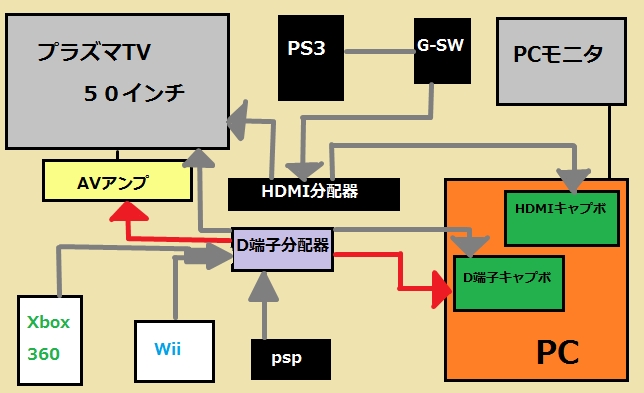 ちなみにこの環境作るのに10万円くらいかかってると思う^^;(分配器x2 GーSW、キャプボx2 その他ケーブル類)