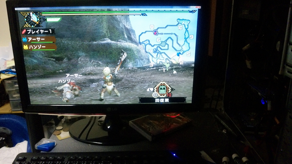 どうやらcfwでMHP3rdの体験版が動くらしいので、早速リモートジョイでPC画面+コントローラーでプレイ♪